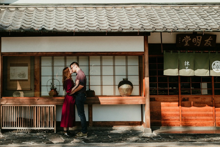 Sus mil templos, sus jardines zen diseñados para inducir la contemplación, sus callejones de Gion con las casas de té de madera y las ventanas de bambú, sus bosques de bambú de Arashiyama que filtran la luz de la mañana de una manera que ningún fotógrafo ha conseguido reproducir del todo fielmente y los templos dorados y plateados de Kinkakuji y Ginkakuji que se reflejan en los estanques crean una atmósfera que actúa sobre las parejas de una manera que ninguna otra ciudad del mundo consigue de la misma manera.