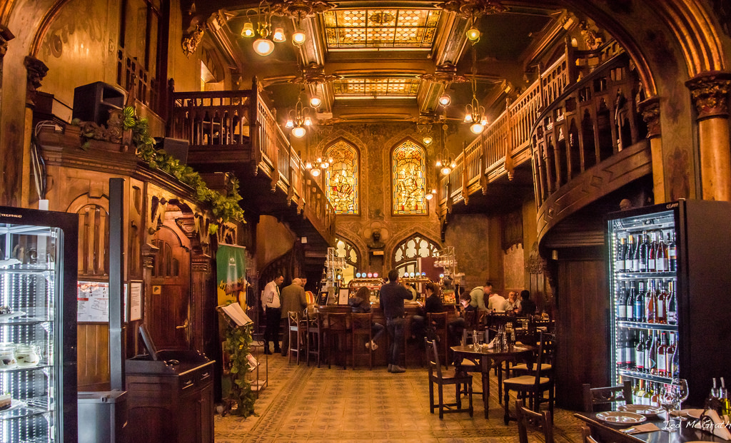 Después de un día de exploración, decidí disfrutar de una cena típica rumana. Me recomendaron un restaurante llamado Caru’ cu Bere. Este lugar, además de ofrecer deliciosa comida, tiene una arquitectura impresionante que me transportó a otra época.