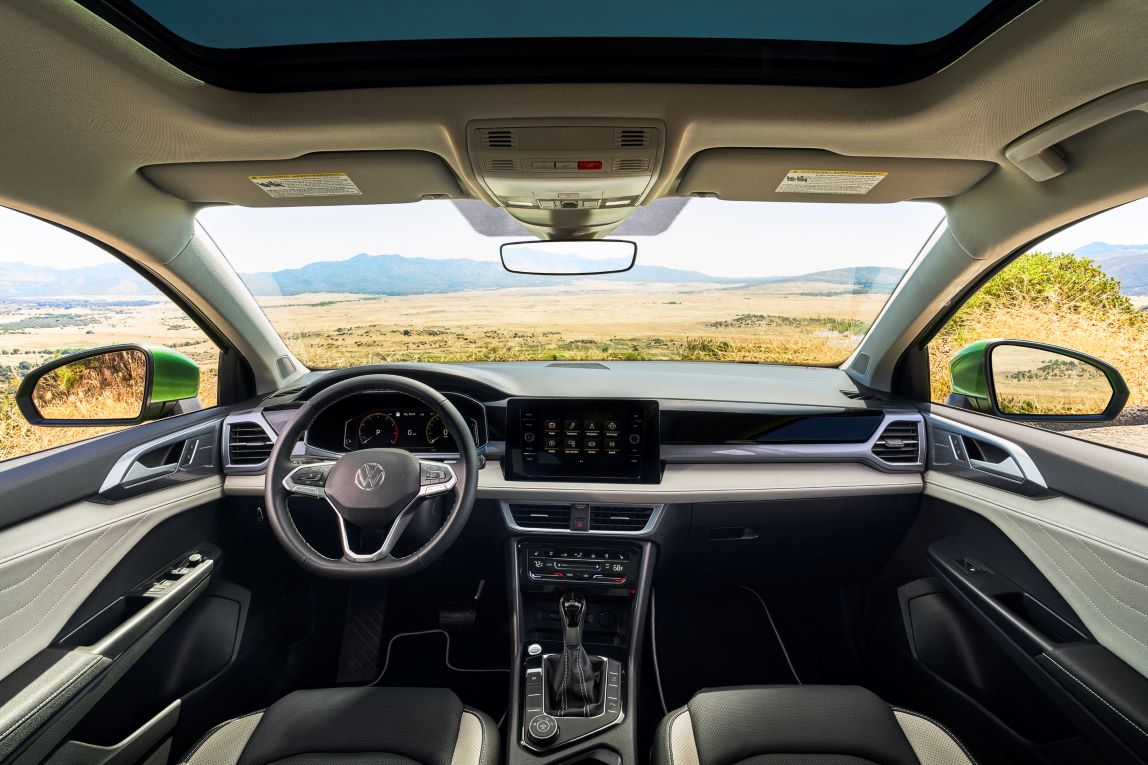 En cuanto a la cabina, el Taos del 2025 presenta un nuevo diseño de tablero, junto con nuevos materiales y colores. Una pantalla de info-entretenimiento flotante de 8 pulgadas es estándar en todos los modelos, mientras que el control táctil para el sistema HVAC Climatronic está disponible en el acabado SE y superior. Los nuevos tratamientos de amortiguación acústica también ayudan a reducir el ruido interior.